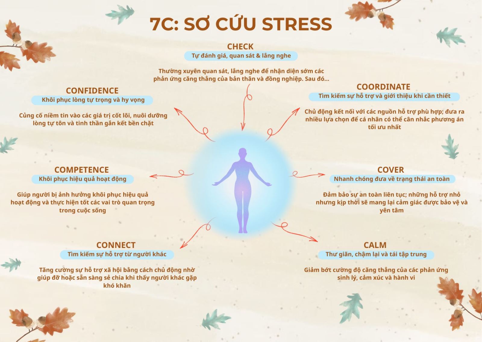 Cuối cùng, hai yếu tố "Competence" (Năng lực) và "Confidence" (Tự tin) đóng vai trò khôi phục sức mạnh hậu căng thẳng.
